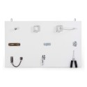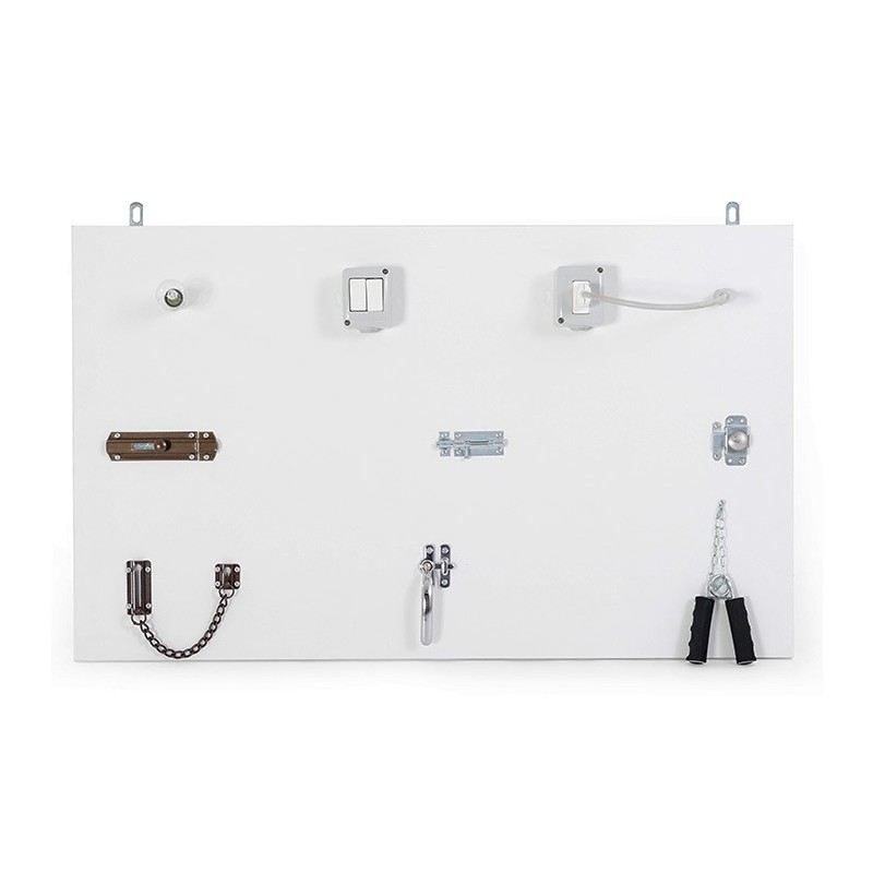 Dispositivo per la riabilitazione degli arti superiori. Pannello da appendere alla parete composto da 9 elementi che simulano le attività quotidiane: Lampadina - Interruttore - Spina elettrica - Chiavistello scorrevole - Chiavistello girevole - Crichetto a scorrimento - Catenella per porta - Maniglia finestra - Manubrio a forca.