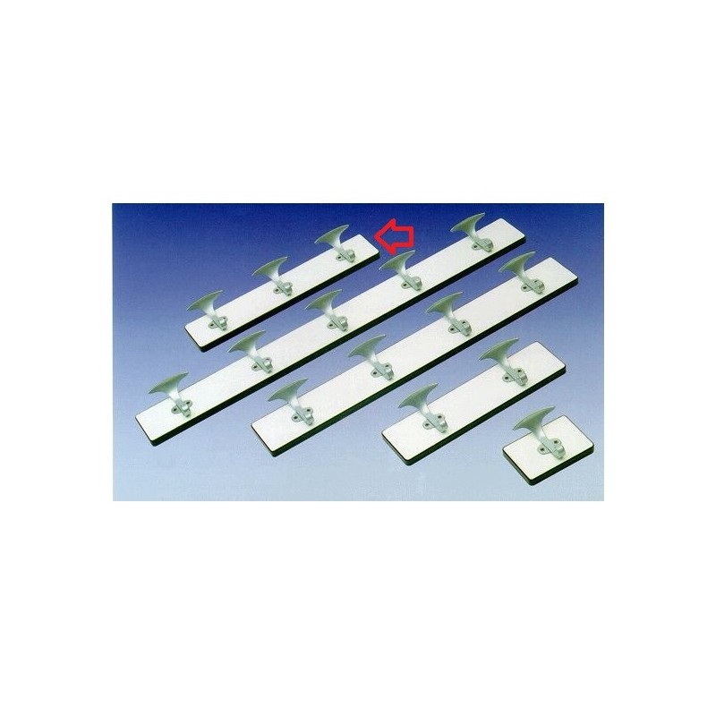 Appendiabiti a muro a 3 posti, costruito in bilaminato di colore bianco di spessore mm 20 bordato in ABS di colore nero; provvisto di no. 2 supporti in ottone per fissaggio a muro, i tre ganci appendiabiti sono invece in lega di alluminio satinato.