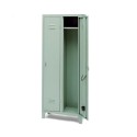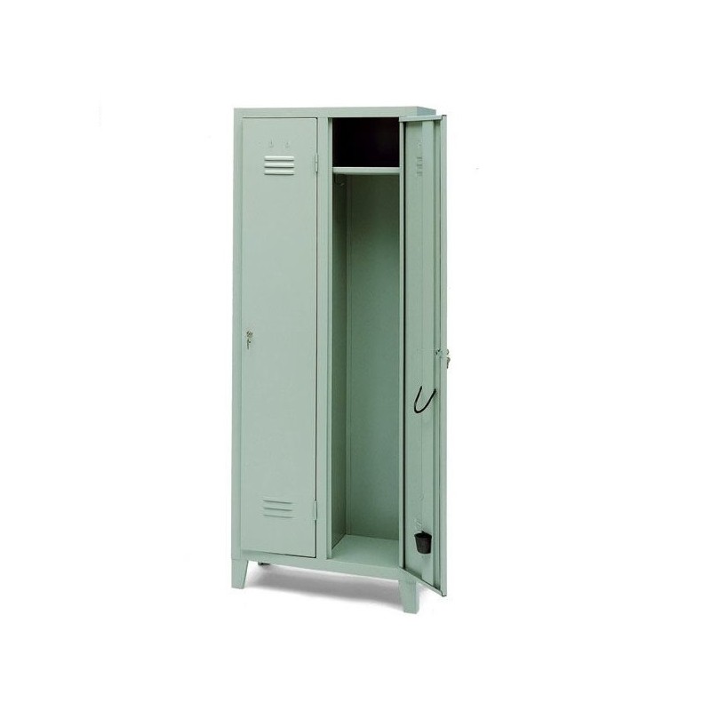 Armadio spogliatoio a due posti, costruito in lamiera di acciaio verniciata a fuoco di colore grigio, con due ante rinforzate a battente su cerniere, ognuna con chiusura a serratura con doppia chiave.