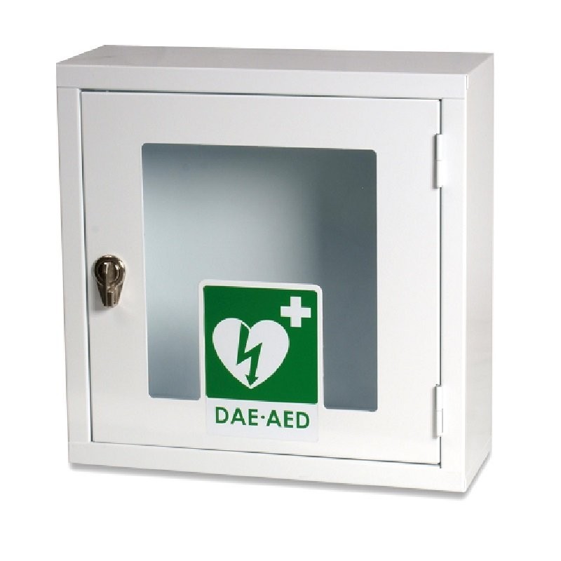 Armadietto in metallo per defibrilatori, uso interno con allarme acustico magnetico da 100 dB. Batteria 9V per allarme.