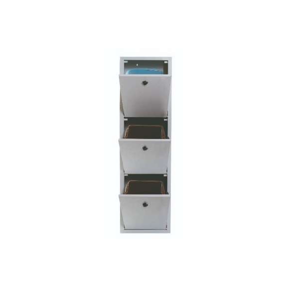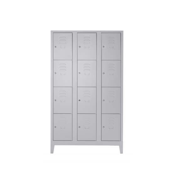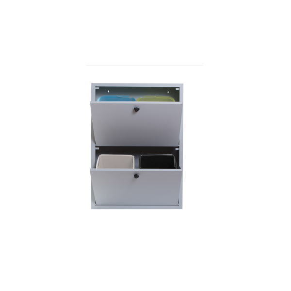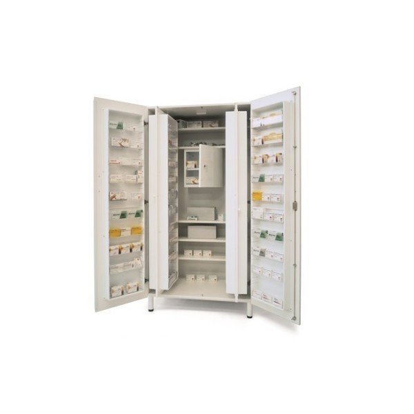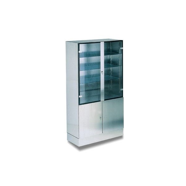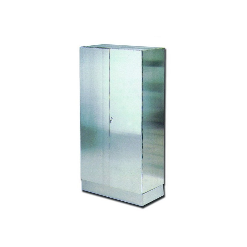 Due ante con serratura (spessore 10/10), 4 mensole regolabili (8/10 inox), 4 piedini regolabili ricoperti da uno zoccolo rimovibile in acciaio.