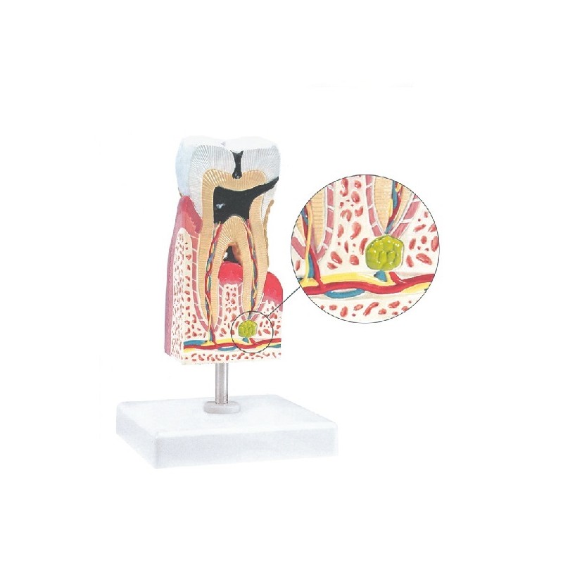 Questo modello a 1 pezzo è approssimativamente 10x della grandezza naturale e mostra le patologie più importanti dei denti, comprese le carie dentali, pulpite, gengivite e parodontite periapicale.