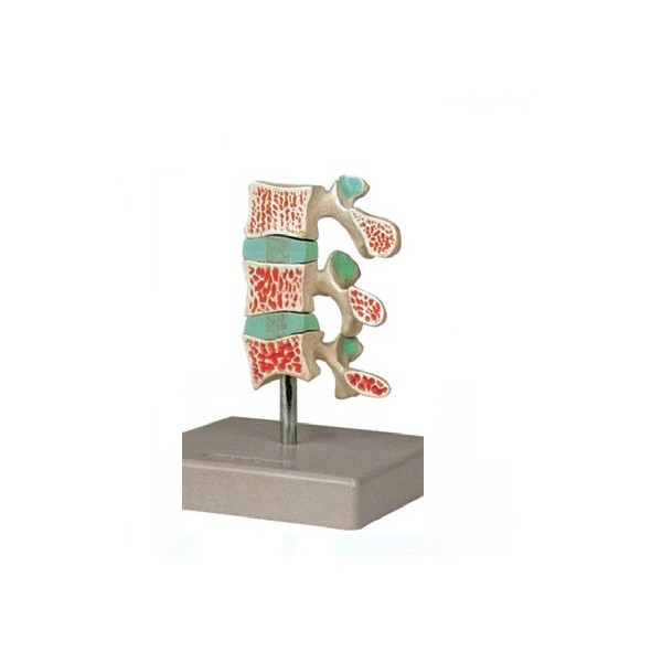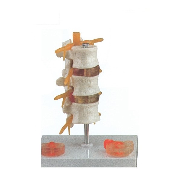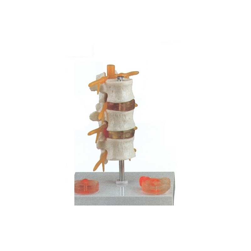 Mostra 3 vertebre lombari, con nervi spinali, dura madre e 2 dischi intervertebrali affetti da ernia laterale e media.