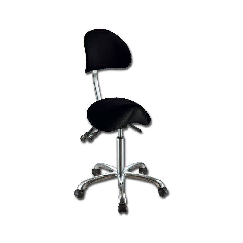Sgabelli ergonomici e confortevoli con seduta a sella e tre leve con pistone a gas consentono la regolazione dell’altezza, inclinazione dello schienale e della seduta.