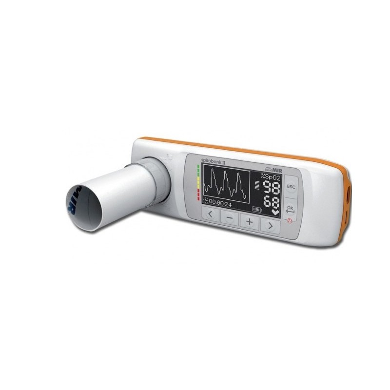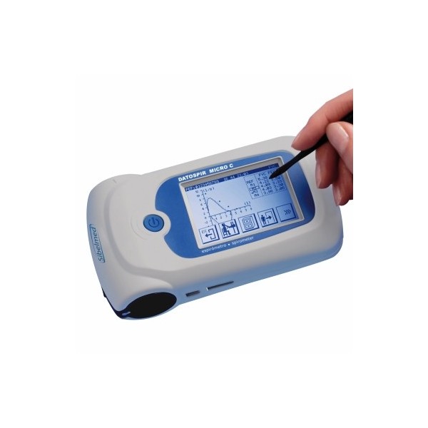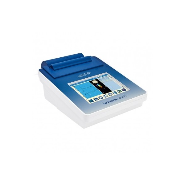 Spirometro dalla capacità di memoria di 10000 test di spirometria, display LCD monocromatico, tastiera a membrana da 6 tasti. Alimentazione con batteria (litio 3,7 V - 1100 mA) con un’autonomia di circa 50 ore di uso continuo, ricaricabile tramite porta USB.