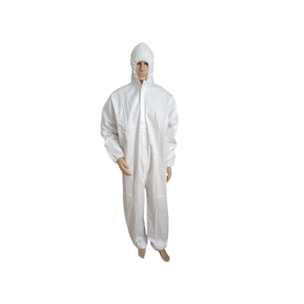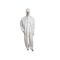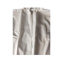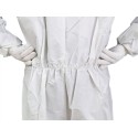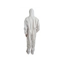 Tute in tessuto non tessuto microporoso traspirante, con cappuccio, polsini elastici, elastico in vita, cerniera frontale.