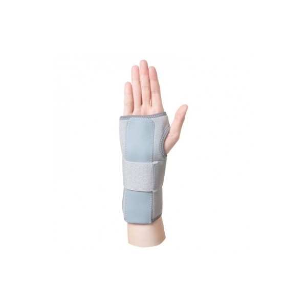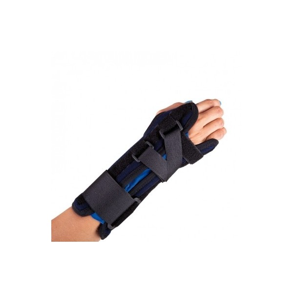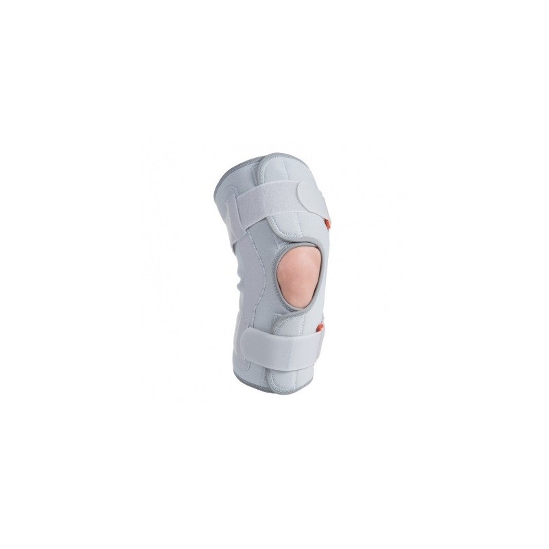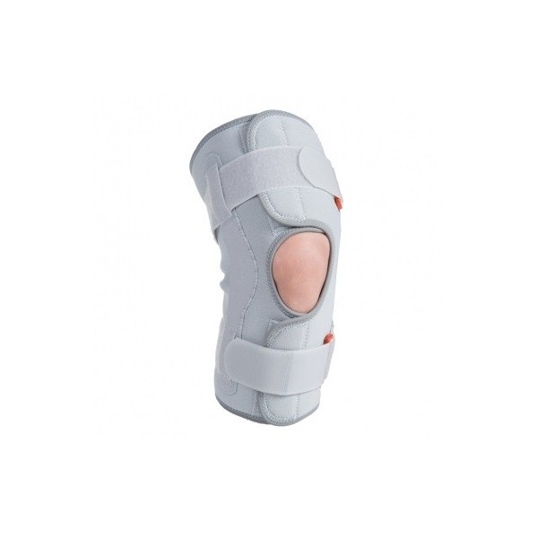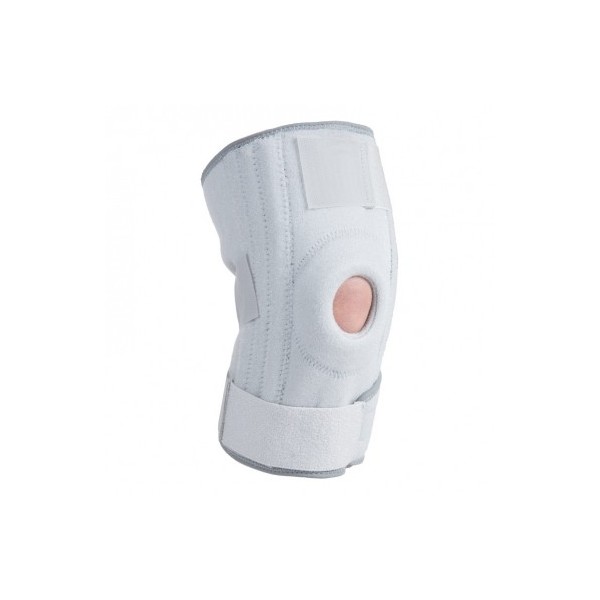 Ginocchiera in neoprene con apertura frontale e foro rotuleo dotata di stecche laterali articolate e fasce a velcro per la chiusura.