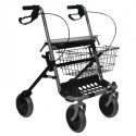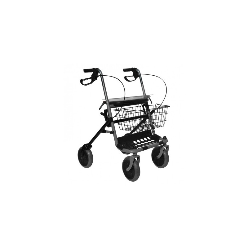 Deambulatore rollatore con ruote anteriori piroettanti e ruote posteriori fisse con sistema frenante.