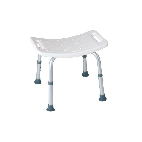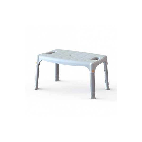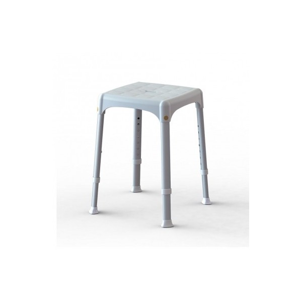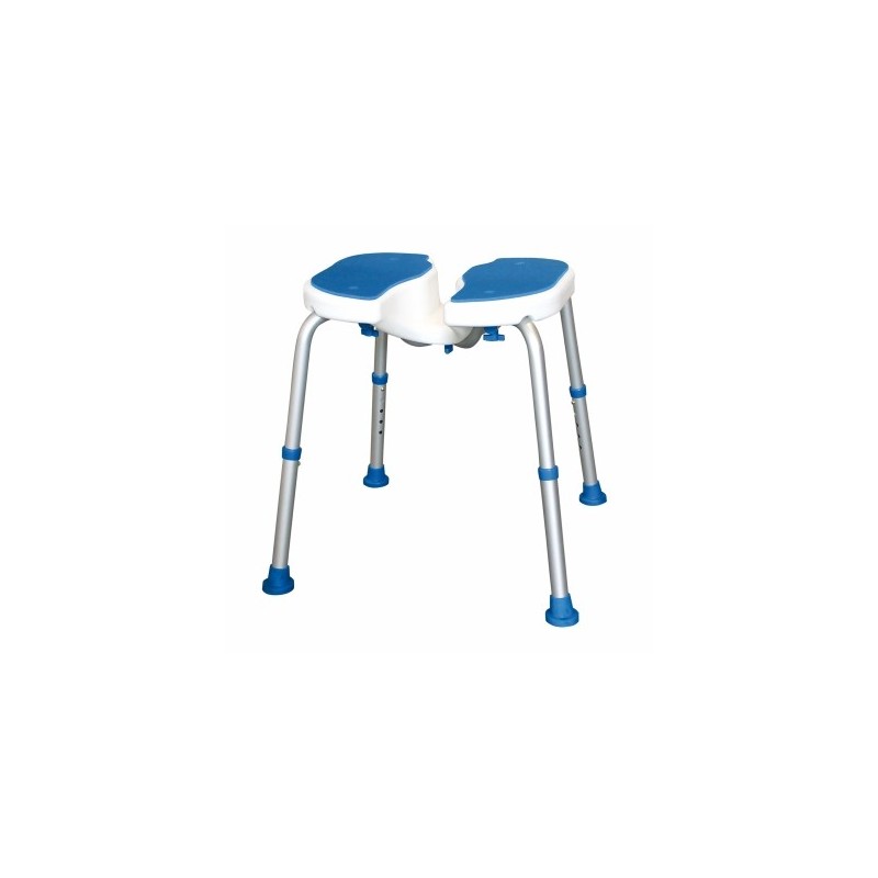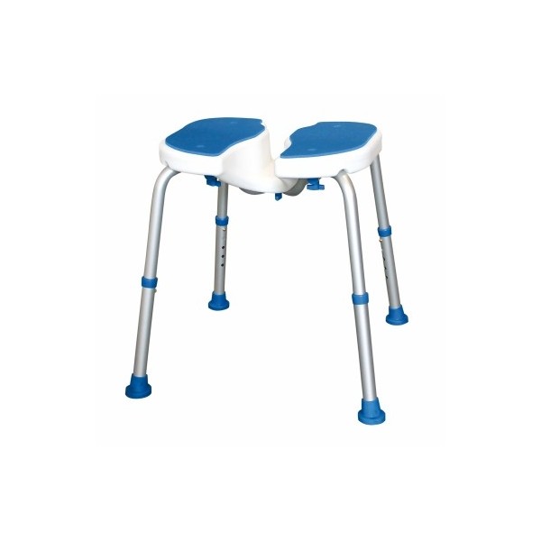 Sgabello per doccia con struttura in alluminio anodizzato regolabile in altezza e seduta in polietilene ergonomica con apertura centrale, per facilitare l’operazione di igiene intima, ricoperta da uno strato di poliuretano morbido e impugnature laterali, dotata in configurazione base: