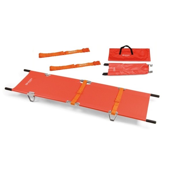 Barella pieghevole per emergenza, in lunghezza ed in larghezza, struttura realizzata in alluminio anodizzato con telo ad alta resistenza, antiputrescente, autoestinguente, lavabile.