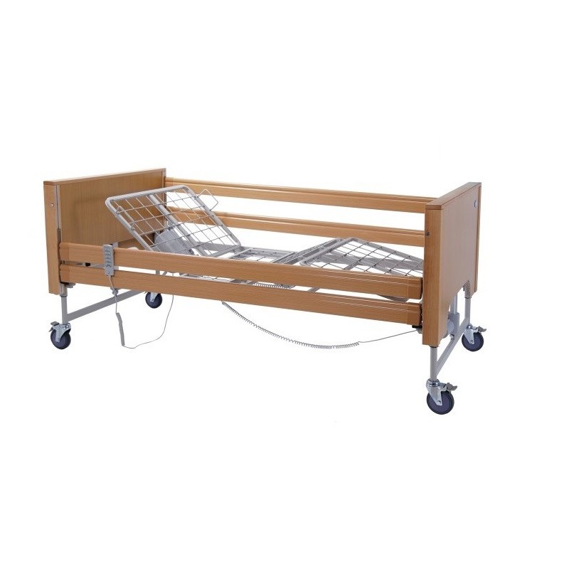 Struttura in tubolare di acciaio verniciato a polveri, piano in rete in acciaio elettrosaldato. Montato su quattro ruote piroettanti da 125mm tutte con blocco totale. Testiera, pediera e sponde in legno.