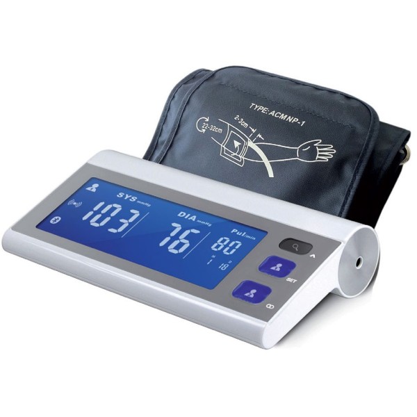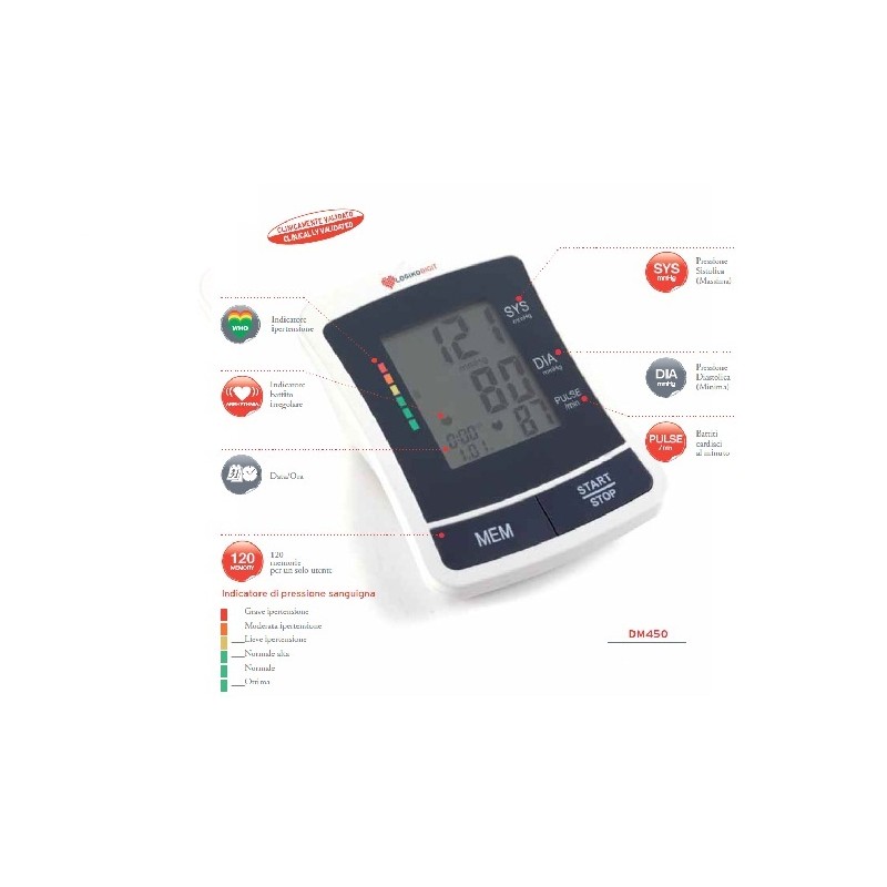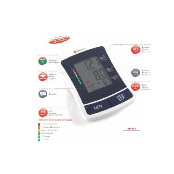 Lo sfigmomanometro digitale automatico da tavolo ha un design innovativo con grande display LCD (4.8") retroilluminato che visualizza contemporaneamente la misurazione rapida e precisa della pressione sistolica, diastolica, della frequenza del battito, data/ora e il rilevamento del battito irregolare IHD (Aritmia). Memorie per 2 utenti.