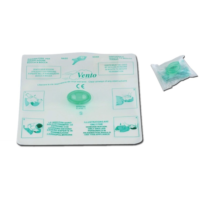 Rianimatore bocca a bocca monouso con valvola unidirezionale in policarbonato e schermo protettivo in PVC atossico per evitare ogni contagio tra paziente e soccorritore.