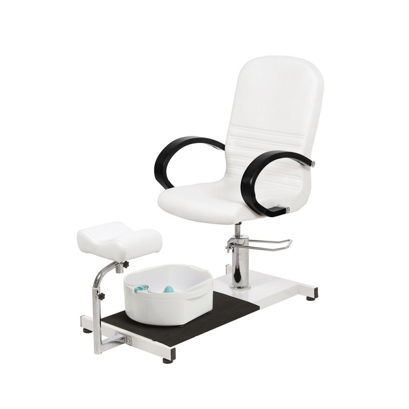 Poltrona per pedicure con vaschetta per i piedi e poggiapiedi girevole e regolabile in altezza.